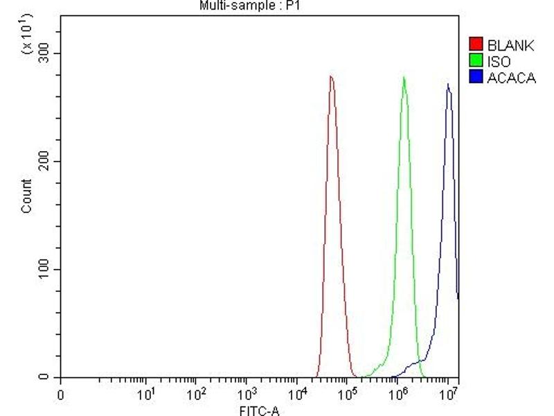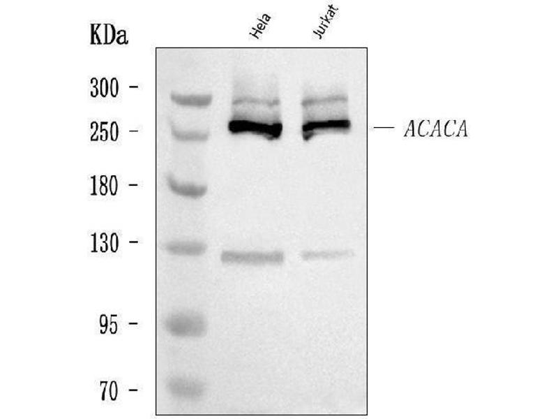 Acetyl-CoA carboxylase (ACC) is a complex multifunctional enzyme system. ACC is a biotin-containing enzyme which catalyzes the carboxylation of acetyl-CoA to malonyl-CoA, the rate-limiting step in fatty acid synthesis. There are two ACC forms, alpha and beta, encoded by two different genes. ACC-alpha is highly enriched in lipogenic tissues. The enzyme is under long term control at the transcriptional and translational levels and under short term regulation by the phosphorylation/dephosphorylation of targeted serine residues and by allosteric transformation by citrate or palmitoyl-CoA. Multiple alternatively spliced transcript variants divergent in the 5' sequence and encoding distinct isoforms have been found for this gene. [provided by RefSeq, Jul 2008].