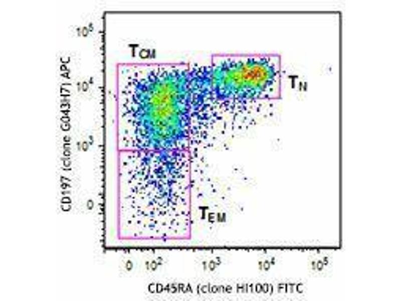 CD4+ T cells can be subdivided into naive, memory, and effector subsets based on their expression of CD45RA and CCR7. Naive T cells express high levels of CD45RA and CCR7, whereas memory T cells express variable levels of these markers. Expression of CCR7 and CD45RA allows differentiation of memory T cells into central (CCR7+CD45RA-) and effector memory (CCR7-CD45RA-) subsets. This panel of antibodies is designed for characterizing these three CD4+ T cell subsets, which may exhibit variations following antigenic stimulation such as viral infection or vaccination.