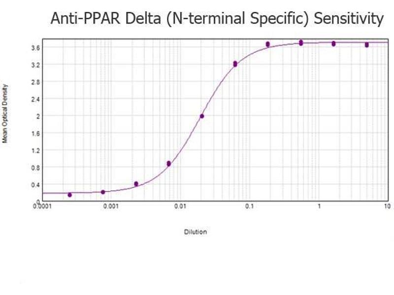 Application Note: This affinity purified antibody has been tested for use in ELISA, IHC, and by western blot. Specific conditions for reactivity should be optimized by the end user. Expect a single band approximately 43 kDa in size corresponding to PPAR delta by western blot in the appropriate tissue or cell lysate.