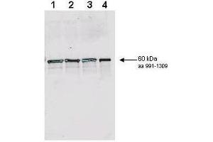 Immunogen: This affinity purified antibody was prepared from whole rabbit serum produced by repeated immunizations with a synthetic peptide corresponding to an internal region near aa 1120-1145 from the aa1309 yeast Rad9 protein conjugated to KLH.