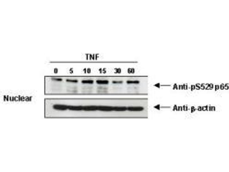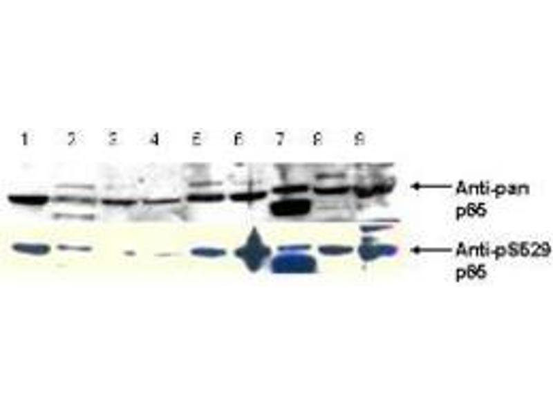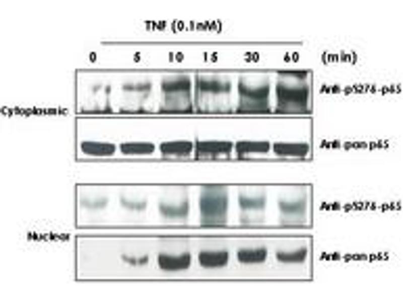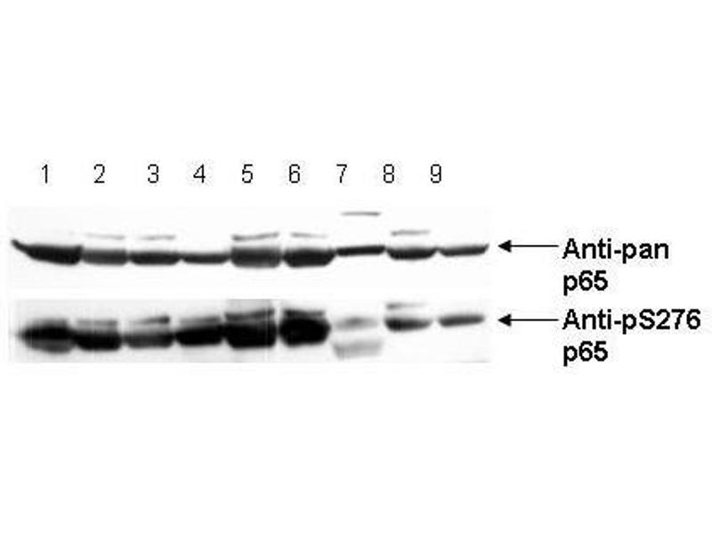 Usage: This phospho specific polyclonal antibody reacts human pS276 p65 and shows minimal reactivity by western blot with non-phosphorylated p65 and minimal reactivity by ELISA against the non-phosphorylated form of the immunizing peptide. A 65 kD band corresponding to human p65 is detected. HeLa cells or TNF inducible KBM-5 cells can be used as a positive control. -