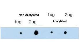 This antibody reacts with over-expressed, acetylated and non-acetylated (at K116) ATDC protein. A BLAST analysis was used to suggest cross-reactivity with ATDC from human, horse, bovine, chimpanzee and macaque based on a 100 % homology with the immunizing sequence. Partial reactivity is expected against rat and mouse ATDC based on 92 % homology with the immunizing sequence. Cross-reactivity with ATDC from other sources has not been determined.