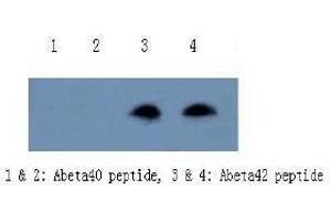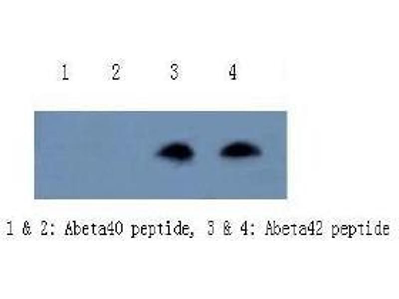 - This antibody specifically recognizes the C-terminal sequence of beta amyloid peptide 42 and full length beta amyloid peptide 42. The antibody does not cross react with beta amyloid peptide 40 in dot blotting and ELISA. Cross-reactivity to beta amyloid peptide 43 is less than 1 % in ELISA.
