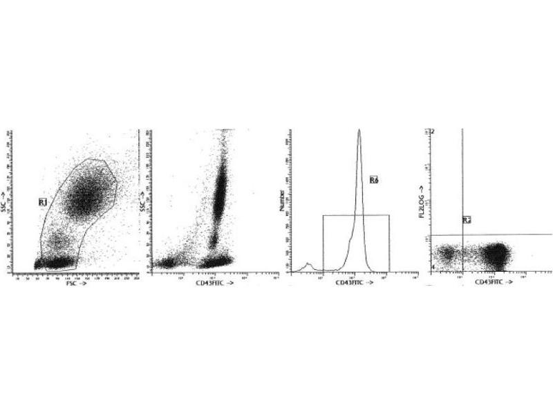 CD43 antigen is expressed on all T cells, NK cells, myeloid cells and monocytes as well as on CD5 positive mature B cells. It is also present on all immature hematopoietic cells in the bone marrow [1]. The antigen is deficient in patients with Wiskott-Aldrich syndrome. A soluble form of CD43 is present in human serum [2]. CD43 may function as an adhesion molecule via interaction with CD54 although this has not been definitely established. It may also inhibit leucocyte interactions with other cells [6]. The antigen is involved in the activation of T-cells, B cells, NK cells and monocytes [5]. The membrane proximal portion of the cytoplasmic domain mediates an association with the cytoskeleton [1].Synonyms: Galactoglycoprotein, Leukocyte sialoglycoprotein, SPN, Sialophorin