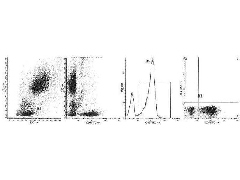 CD7 is the earliest antigen marker expressed in the T lineage, being found on T cell precursors in fetal liver and thorax prior to thymic colonization and in thymus and bone marrow. The function of CD7 antigen is unknown and the natural ligand for CD7 has not yet been identified. CD7 monoclonal antibodies co-stimulate T cell proliferation and induce second messengers, while soluble recombinant CD7 has been reported to inhibit antigen-specific proliferation and a mixed lymphocyte reaction. CD7 is a marker for pluripotential stem cell leukemias and T cell acute lymphocytic leukemia (T-ALL). The antigen is frequently lost on large cell T cell lymphomas. The CD7 antigen may also be expressed on myeloblastic leukemias.Synonyms: GP40, Leu-9, T-cell leukemia antigen, TP41