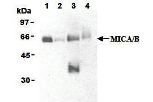 MICA and MICB (Major Histocompatibility Complex class I Chain-related gene A and gene B) bind to the activating immunoreceptor NKG2D. NKG2D is expressed on NK (Natural Killer) cells, NKT cells, γδT cells and CD8+αβT cells. Recognition of MICA and MICB by NKG2D is involved in tumor surveillance, immune responses to viral infections and autoimmune diseases. MICA and MICB are transmembrane glycoproteins that are distantly related to the MIC proteins, and they possess three extra-cellular Ig-like domains. And thus, MICA and MICB are closely related but are functionally indistinguishable. MICA and MICB molecules are highly glycosylated, and are detected as a smear band ranging from 65-75 kDa. It is reported that MICA and MICB are highly expressed in variant tumor cells, whereas normal cells express little. Tumor cells have been shown to shed and release MIC molecules from the cell surface. Therefore determination of soluble MIC (sMIC) levels provides valuable information for cancer staging, andsMIC in serum seems to be an indicator for systemic manifestation of malignancy rather than for local tumor extent.Synonyms: MHC class I polypeptide-related sequence A, MHC class I polypeptide-related sequence B, MIC-A, MIC-B, PERB11.1, PERB11.2