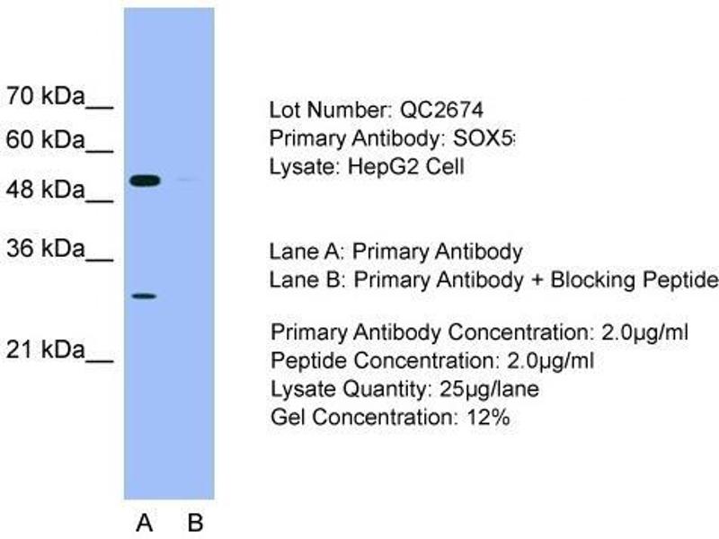 SOX5 encodes a member of the SOX (SRY-related HMG-box) family of transcription factors involved in the regulation of embryonic development and in the determination of the cell fate. The encoded protein may act as a transcriptional regulator after forming a protein complex with other proteins. The encoded protein may play a role in chondrogenesis. A pseudogene of this gene is located on chromosome 8.Synonyms: L-SOX5, SRY (sex determining region Y)-box 5, SRY-box 5, Transcription factor SOX-5