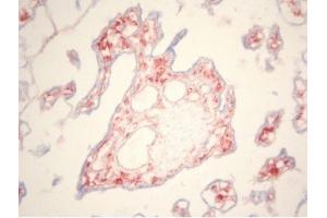 Immunohistochemistry on Frozen Sections: 4 μg/mL (1/100). Does not work in routinely processed paraffin sections. Has been described to work in FACS and Western blots. Recommended Positive control: Human placenta.