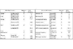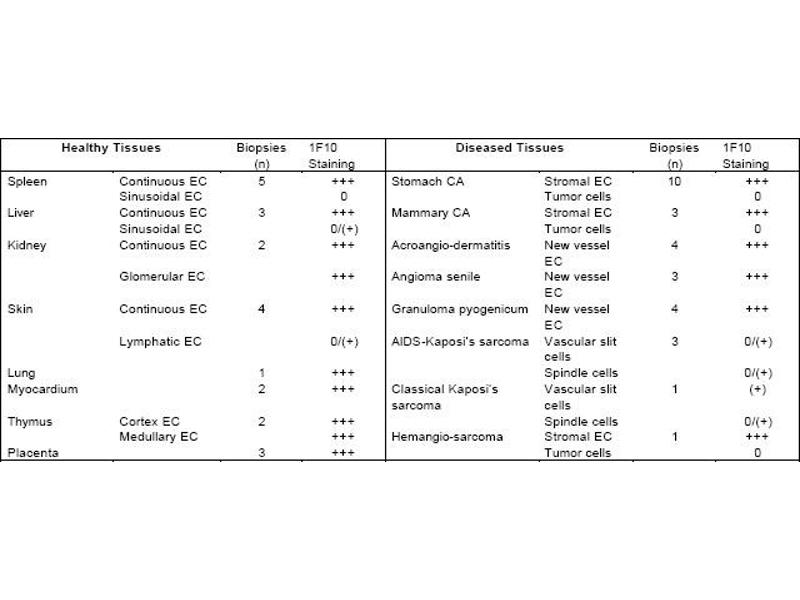 Immunohistochemistry on Frozen sections: 2 μg/mL (1: 100),Suggested positive control: Human placenta. Antigen Distribution: The antigen is found in variable amounts on freshly isolated isolated HUVE cells. Antigenexpression on cultured HUVEC is dependent on the culture conditions. Best results wereobtained (40-70 % pos. ) by daily renewal of FCS containing medium supplemented withendothelial cell conditioned supernatant whereas commercial available specificendothelial cell media have no influence on the antigen expression (see Table 1).