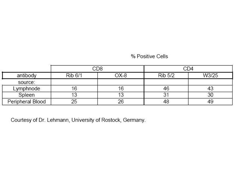 - This antibody detcts T-cell subpopulation, thmocytes. Antigen distribution: Isolated cells: Subpopulation of T-cells in the peripheral blood. Tissue sections: Rib 6/1 detects the T-cell regions in lymphoid organs and stains cortical and medullary thymocytes positively. Monoclonal antibody Rib 6/1 is used for the identificaton of CD8 bearing cells, mainly Tcytotoxic and suppressor lymphocytes, in tissue sections and isolated cell suspensions. Preliminary results indicate that the Rib 6/1 antigen is the β-chain of the CD8 antigen which is not expressed by NK-cells.