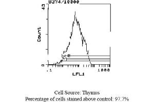 FLOW CYTOMETRY ANALYSIS: Method: 1. Prepare a cell suspension in media A. For cell preparations, deplete the red blood cellpopulation with Lympholyte®-M cell separation medium. 2. Wash 2 times. 3. Resuspend the cells to a concentration of 2x10e7 cells/ml in media A. Add 50 µl of thissuspension to each tube (each tube will then contain 1 x 10e6 cells, representing 1 test). 4. To each tube, add 0. 1 - 0. 2 µg* of this Ab per 10e6 cells. 5. Vortex the tubes to ensure thorough mixing of antibody and cells. 6. Incubate the tubes for 30 minutes at 4°C. 7. Wash 2 times at 4°C. 8. Add 100 µl of secondary antibody (Streptavidin-FITC) at a 1: 500 dilution. 9. Incubate tubes at 4°C for 30 - 60 minutes. 10. Wash 2 times at 4°C. 11. Resuspend the cell pellet in 50 µl ice cold media B. 12. Transfer to suitable tubes for flow cytometric analysis containing 15 µl of propidiumiodide at 0. 5 mg/ml in PBS. This stains dead cells by intercalating in DNA. Media: A. Phosphate buffered saline (pH 7. 2) + 5% normal serum of host species + sodium azide(100 µl of 2M sodium azide in 100 mls). B. Phosphate buffered saline (pH 7. 2) + 0. 5% Bovine serum albumin + sodium azide (100µl of 2M sodium azide in 100 mls). Results - Tissue DistributionMouse Strain: BALB/cCell Concentration: 1x10e6 cells per testsAntibody Concentration Used: 0. 1 µg/10e6 cellsIsotypic Control: Biotin Mouse IgG2b,kResults - Strain DistributionCell Concentration: 1x10e6 cells per testsAntibody Concentration Used: 0. 1 µg/10e6 cellsStrains Tested: BALB/C, C3H/He, CBA/J, AKR, ATHPositive: BALB/C, AKR, ATHNegative: C3H/He, CBA/J