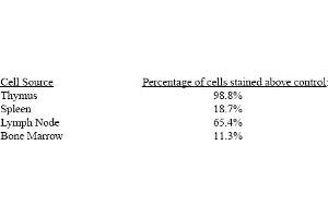 - FLOW CYTOMETRY ANALYSIS: Method: 1. Prepare a cell suspension in media A. For cell preparations, deplete the red blood cellpopulation with Lympholyte®-M cell separation medium. 2. Wash 2 times. 3. Resuspend the cells to a concentration of 2x10e7 cells/ml in media A. Add 50 µl of thissuspension to each tube (each tube will then contain 1 x 10e6 cells, representing 1 test). 4. To each tube, add 0. 5 µg* of this Ab per 10e6 cells. 5. Vortex the tubes to ensure thorough mixing of antibody and cells. 6. Incubate the tubes for 30 minutes at 4°C. (It is recommended that the tubes areprotected from light, since most fluorochromes are light sensitive. )7. Wash 2 times at 4°C. 8. Resuspend the cell pellet in 50 µl ice cold media B. 9. Transfer to suitable tubes for flow cytometric analysis containing 15 µl of propidiumiodide at 0. 5 mg/ml in PBS. This stains dead cells by intercalating in DNA. Media: A. Phosphate buffered saline (pH 7. 2) + 5% normal serum of host species + sodium azide(100 µl of 2M sodium azide in 100 mls). B. Phosphate buffered saline (pH 7. 2) + 0. 5% Bovine serum albumin + sodium azide (100µl of 2M sodium azide in 100 mls). Results - Tissue DistributionMouse Strain: BALB/cCell Concentration: 1x10e6 cells per testsAntibody Concentration Used: 0. 5 µg/10e6 cellsIsotypic Control: PE Mouse IgG2b