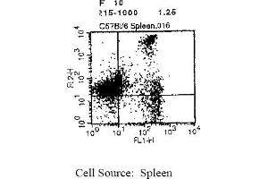 - FLOW CYTOMETRY ANALYSIS: Method: 1. Prepare a cell suspension in media A. For cell preparations, deplete the red blood cellpopulation with Lympholyte®-M cell separation medium. 2. Wash 2 times. 3. Resuspend the cells to a concentration of 2x10e7 cells/ml in media A. Add 50 µl of thissuspension to each tube (each tube will then contain 1 x 10e6 cells, representing 1 test). 4. To each tube, add ~0. 125 µg* of this Ab per 10e6 cells. 5. Vortex the tubes to ensure thorough mixing of antibody and cells. 6. Incubate the tubes for 30 minutes at 4°C. 7. Wash 2 times at 4°C. 8. Add 100 µl of secondary antibody (Streptavidin-PE) at a 1: 5 dilution. 9. Incubate tubes at 4°C for 30 - 60 minutes (It is recommended that tubes are protectedfrom light since most fluorochromes are light sensitive). 10. Wash 2 times at 4°C. 11. Resuspend the cell pellet in 50 µl ice cold media B. 12. Transfer to suitable tubes for flow cytometric analysis containing 15 µl of propidiumiodide at 0. 5 mg/ml in PBS. This stains dead cells by intercalating in DNA. Media: A. Phosphate buffered saline (pH 7. 2) + 5% normal serum of host species + sodium azide(100 µl of 2M sodium azide in 100 mls). B. Phosphate buffered saline (pH 7. 2) + 0. 5% Bovine serum albumin + sodium azide (100µl of 2M sodium azide in 100 mls). Results: Representative Dot PlotMouse Strain: BALB/cCell Concentration: 1x10e6 cells per testAntibody Concentration Used: 0. 125 µg/10e6 cellsIsotypic Control: Biotin Rat IgG2a