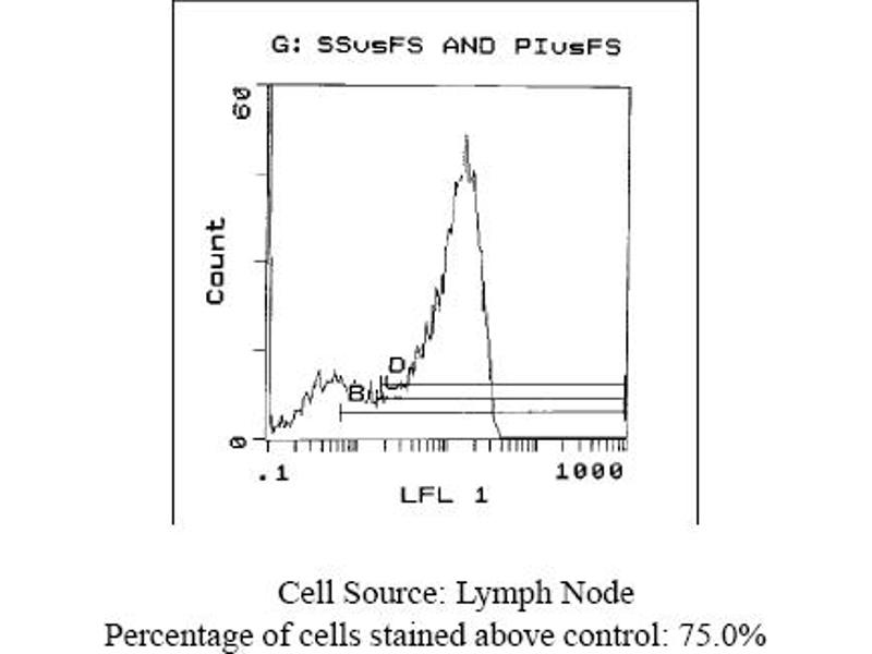 FLOW CYTOMETRY ANALYSIS: Method: 1. Prepare a cell suspension in media A. For cell preparations, deplete the red blood cellpopulation with Lympholyte®-M cell separation medium. 2. Wash 2 times. 3. Resuspend the cells to a concentration of 2x10e7 cells/ml in media A. Add 50 µl of thissuspension to each tube (each tube will then contain 1x10e6 cells, representing 1 test). 4. To each tube, add 0. 1-0. 2 µg* of this Ab. 5. Vortex the tubes to ensure thorough mixing of antibody and cells. 6. Incubate the tubes for 30 minutes at 4°C. 7. Wash 2 times at 4°C. 8. Add 100 µl of secondary antibody (FITC Goat anti-rat IgG (H+L)) at 1: 700 dilution. 9. Incubate the tubes at 4°C for 30-60 minutes. (It is recommended that the tubes areprotected from light since most fluorochromes are light sensitive). 10. Wash 2 times at 4°C in media B. 11. Resuspend the cell pellet in 50 µl ice cold media B. 12. Transfer to suitable tubes for flow cytometric analysis containing 15 µl of propidiumiodide at 0. 5 mg/ml in PBS. This stains dead cells by intercalating in DNA. Media: A. Phosphate buffered saline (pH 7. 2) + 5% normal serum of host species + sodium azide(100 µl of 2M sodium azide in 100 mls). B. Phosphate buffered saline (pH 7. 2) + 0. 5% Bovine serum albumin + sodium azide (100µl of 2M sodium azide in 100 mls). Results - Tissue Distribution: Mouse Strain: BALB/cCell Concentration: 1x10e6 cells per testAntibody Concentration Used: 0. 2 µg/10e6 cellsIsotypic Control: Rat IgG2aCell Source: Percentage of cells stained above controlThymus: 85. 8%Spleen: 41. 0%Lymph Node: 75. 0%