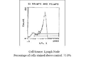 - FLOW CYTOMETRY ANALYSIS: Method: 1. Prepare a cell suspension in media A. For cell preparations, deplete the red blood cellpopulation with Lympholyte®-M cell separation medium. 2. Wash 2 times. 3. Resuspend the cells to a concentration of 2x10e7 cells/ml in media A. Add 50 µl of thissuspension to each tube (each tube will then contain 1x10e6 cells, representing 1 test). 4. To each tube, add 0. 1-0. 2 µg* of this Ab. 5. Vortex the tubes to ensure thorough mixing of antibody and cells. 6. Incubate the tubes for 30 minutes at 4°C. 7. Wash 2 times at 4°C. 8. Add 100 µl of secondary antibody (FITC Goat anti-rat IgG (H+L)) at 1: 700 dilution. 9. Incubate the tubes at 4°C for 30-60 minutes. (It is recommended that the tubes areprotected from light since most fluorochromes are light sensitive). 10. Wash 2 times at 4°C in media B. 11. Resuspend the cell pellet in 50 µl ice cold media B. 12. Transfer to suitable tubes for flow cytometric analysis containing 15 µl of propidiumiodide at 0. 5 mg/ml in PBS. This stains dead cells by intercalating in DNA. Media: A. Phosphate buffered saline (pH 7. 2) + 5% normal serum of host species + sodium azide(100 µl of 2M sodium azide in 100 mls). B. Phosphate buffered saline (pH 7. 2) + 0. 5% Bovine serum albumin + sodium azide (100µl of 2M sodium azide in 100 mls). Results - Tissue Distribution: Mouse Strain: BALB/cCell Concentration: 1x10e6 cells per testAntibody Concentration Used: 0. 2 µg/10e6 cellsIsotypic Control: Rat IgG2aCell Source: Percentage of cells stained above controlThymus: 85. 8%Spleen: 41. 0%Lymph Node: 75. 0%