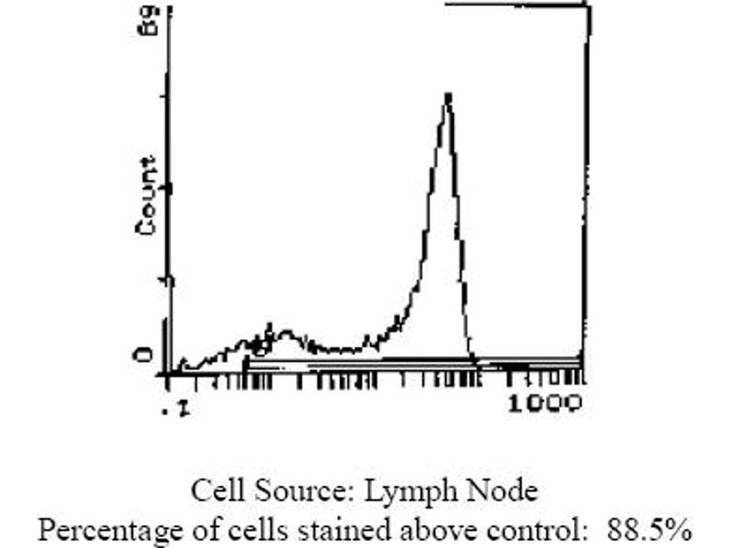 FLOW CYTOMETRY ANALYSIS: Method: 1. Prepare a cell suspension in media A. For cell preparations, deplete the red blood cellpopulation with Lympholyte®-M cell separation medium. 2. Wash 2 times. 3. Resuspend the cells to a concentration of 2x10e7 cells/ml in media A. Add 50 µl of thissuspension to each tube (each tube will then contain 1x10e6 cells, representing 1 test). 4. To each tube, add 0. 5-1. 0 µg* of this Ab per 10e6 cells. 5. Vortex the tubes to ensure thorough mixing of antibody and cells. 6. Incubate the tubes for 30 minutes at 4°C. (It is recommended that the tubes areprotected from light since most fluorochromes are light sensitive). 7. Wash 2 times at 4°C. 8. Resuspend the cell pellet in 50 µl ice cold media B. 9. Transfer to suitable tubes for flow cytometric analysis containing 15 µl of propidiumiodide at 0. 5 mg/ml in PBS. This stains dead cells by intercalating in DNA. Media: A. Phosphate buffered saline (pH 7. 2) + 5% normal serum of host species + sodium azide(100 µl of 2M sodium azide in 100 mls). B. Phosphate buffered saline (pH 7. 2) + 0. 5% Bovine serum albumin + sodium azide (100µl of 2M sodium azide in 100 mls). Results - Tissue Distribution: Mouse Strain: BALB/cCell Concentration: 1x10e6 cells per testAntibody Concentration Used: 1. 0 µg/10e6 cellsIsotypic Control: PE Rat IgG2aCell Source: Percentage of cells stained above control: Thymus: 89. 1%Spleen: 34. 8%Lymph Node: 88. 5%Results - Strain Distribution: Cell Concentration: 1x10e6 cells per testAntibody Concentration Used: 1. 0 µg/10e6 cellsStrains Tested: BALB/c, CBA/J, C3H/He, C57BL/6, AKR