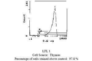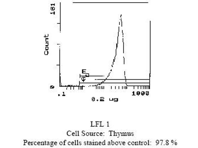 FLOW CYTOMETRY ANALYSIS: Method: 1. Prepare a cell suspension in media A. For cell preparations, deplete the red blood cellpopulation. 2. Wash 2 times. 3. Resuspend the cells to a concentration of 2x10e7 cells/ml in media A. Add 50 µl of thissuspension to each tube (each tube will then contain 1 x 10e6 cells, representing 1 test). 4. To each tube, add 0. 2-0. 5 µg of this antibody per 10e6 cells. 5. Vortex the tubes to ensure thorough mixing of antibody and cells. 6. Incubate the tubes for 30 minutes at 4°C. 7. Wash 2 times at 4°C. 8. Add 100 µl of secondary antibody (Streptavidin-FITC) at a 1/500 dilution. 9. Incubate tubes at 4°C for 30-60 minutes (It is recommended that tubes are protectedfrom light since most fluorochromes are light sensitive). 10. Wash 2 times at 4°C. 11. Resuspend the cell pellet in 50 µl ice cold media B. 12. Transfer to suitable tubes for flow cytometric analysis containing 15 µl of propidiumiodide at 0. 5 mg/ml in PBS. This stains dead cells by intercalating in DNA. Media: A. Phosphate buffered saline (pH 7. 2) + 5% normal serum of host species + sodium azide(100 µl of 2M sodium azide in 100 mls). B. Phosphate buffered saline (pH 7. 2) + 0. 5% Bovine serum albumin + sodium azide (100µl of 2M sodium azide in 100 mls). Results: Tissue Distribution by Flow Cytometry Analysis: Mouse Strain: CBA/JCell Concentration : 1x10e6 cells per testsAntibody Concentration Used: 0. 2 µg/10e6 cellsIsotypic Control: Biotin Mouse IgG2b,kCell Source: Percentage of cells stained above control: Thymus: 97. 8%Spleen: 35. 4%