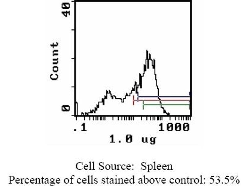 FLOW CYTOMETRY ANALYSIS: Method: 1. Prepare a cell suspension in media A. For cell preparations, deplete the red blood cellpopulation with Rat cell separation medium. 2. Wash 2 times. 3. Resuspend the cells to a concentration of 2x10e7 cells/ml in media A. Add 50 µl of thissuspension to each tube (each tube will then contain 1x10e6 cells, representing 1 test). 4. To each tube, add 1. 0-0. 5 µg* of ABIN114366 or ABIN114366X. 5. Vortex the tubes to ensure thorough mixing of antibody and cells. 6. Incubate the tubes for 30 minutes at 4°C. 7. Wash 2 times at 4°C. 8. Add 100 µl of secondary antibody (FITC Goat anti-mouse IgG (H+L)) at 1: 500 dilution. 9. Incubate the tubes at 4°C for 30-60 minutes. (It is recommended that the tubes are protected from light since most fluorochromes arelight sensitive). 10. Wash 2 times at 4°C in media B. 11. Resuspend the cell pellet in 50 µl ice cold media B. 12. Transfer to suitable tubes for flow cytometric analysis containing 15 µl of propidiumiodide at 0. 5 mg/ml in PBS. This stains dead cells by intercalating in DNA. Media: A. Phosphate buffered saline (pH 7. 2) + 5% normal serum of host species + sodium azide(100 µl of 2M sodium azide in 100 mls). B. Phosphate buffered saline (pH 7. 2) + 0. 5% Bovine serum albumin + sodium azide (100µl of 2M sodium azide in 100 mls). Results-Tissue Distribution: Rat Strain: WistarCell Concentration: 1 x 10e6 cells per testsAntibody Concentration Used: 0. 2 µg/10e6 cellsIsotypic Control: Mouse IgG2a. Cell Source-Percentage of cells stained above control: Thymus: 82. 1%Spleen: 53. 5%Lymph Node: 87. 1%N. B. Appropriate control samples should always be included in any labelling studies. * For optimal results in various applications, it is recommended that each investigatordetermine dilutions appropriate for individual use.
