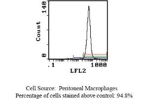- FLOW CYTOMETRY ANALYSIS: Method: 1. Prepare a cell suspension in media A. For cell preparations, deplete the red blood cellpopulation with Lympholyte®-Rat cell separation medium. 2. Wash 2 times. 3. Resuspend the cells to a concentration of 2x10e7 cells/ml in media A. Add 50 µl of thissuspension to each tube (each tube will then contain 1x10e6 cells, representing 1 test). 4. To each tube, add 0. 5-1. 0 µg* of this Ab. 5. Vortex the tubes to ensure thorough mixing of antibody and cells. 6. Incubate the tubes for 30 minutes at 4°C. 7. Wash 2 times at 4°C. 8. Add 5 µl (1 µg) of secondary antibody (PE Goat anti-mouse F(ab1)2 IgG (H+L)) to eachtube. 9. Incubate the tubes at 4°C for 30-60 minutes. (It is recommended that the tubes areprotected from light since most fluorochromes are light sensitive). 10. Wash 2 times at 4°C in media B. 11. Resuspend the cell pellet in 50 µl ice cold media B. 12. Transfer to suitable tubes for flow cytometric analysis containing 15 µl of propidiumiodide at 0. 5 mg/ml in PBS. This stains dead cells by intercalating in DNA. Media: A. Phosphate buffered saline (pH 7. 2) + 5% normal serum of host species + sodium azide(100 µl of 2M sodium azide in 100 mls). B. Phosphate buffered saline (pH 7. 2) + 0. 5% Bovine serum albumin + sodium azide (100µl of 2M sodium azide in 100 mls). Results - Tissue Distribution: Rat Strain: LewisCell Concentration: 1x10e6 cells per testAntibody Concentration Used: 1. 0 µg/10e6 cellsIsotypic Control: Purified Mouse IgG1,kCell Source Percentage of cells stained above control: Thymus: 1. 12%Peritoneal Macrophages: 94. 8%Results - Strain Distribution: Antibody Concentration: 1. 0 µg/10e6 cellsStrains Tested: Wistar, Brown Norway, Buffalo, Fischer 344Positive: Buffalo, Brown Norway, Fischer 344, WistarNegative: none