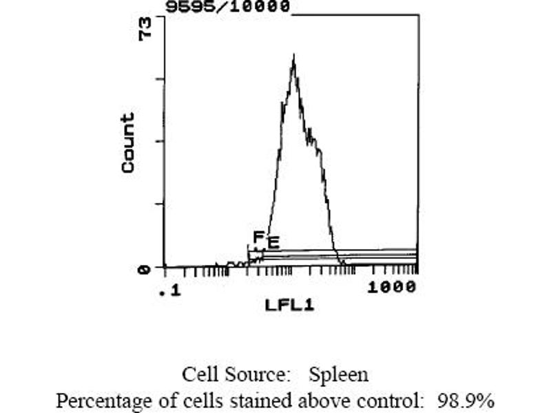 - FLOW CYTOMETRY ANALYSIS: Method: 1. Prepare a cell suspension in media A. For cell preparations, deplete the red blood cellpopulation with Lympholyte®-Rat cell separation medium. 2. Wash 2 times. 3. Resuspend the cells to a concentration of 2x10e7 cells/ml in media A. Add 50 µl of thissuspension to each tube (each tube will then contain 1 x 10e6 cells, representing 1 test). 4. To each tube, add 0. 5-1. 0 µg* of this Ab per 10e6 cells. 5. Vortex the tubes to ensure thorough mixing of antibody and cells. 6. Incubate the tubes for 30 minutes at 4°C. 7. Wash 2 times at 4°C. 8. Add 100 µl of secondary antibody (Streptavidin-FITC) at a 1: 500 dilution. Notrecommended for use with a PE secondary. 9. Incubate tubes at 4°C for 30 - 60 minutes (It is recommended that tubes are protectedfrom light since most fluorochromes are light sensitive). 10. Wash 2 times at 4°C. 11. Resuspend the cell pellet in 50 µl ice cold media B. 12. Transfer to suitable tubes for flow cytometric analysis containing 15 µl of propidiumiodide at 0. 5 mg/ml in PBS. This stains dead cells by intercalating in DNA. Media: A. Phosphate buffered saline (pH 7. 2) + 5% normal serum of host species + sodium azide(100 µl of 2M sodium azide in 100 mls). B. Phosphate buffered saline (pH 7. 2) + 0. 5% Bovine serum albumin + sodium azide (100µl of 2M sodium azide in 100 mls). Results - Tissue Distribution: Rat Strain: Brown NorwayCell Concentration: 1x10e6 cells per testAntibody Concentration Used: 1. 0 µg/10e6 cellsIsotypic Control: Biotin Mouse IgG2aCell Source Percentage of cells stained above control: Thymus 65. 4%Spleen 98. 9%Lymph Node 100%Restults - Strain Distribution: Cell Concentration: 1x10e6 cells per testAntibody Concentration Used: 1. 0 µg/10e6 cellsStrains Tested: Brown Norway, Buffalo, Wistar, Fischer, ACIPositive: Brown NorwayNegative: Buffalo, Wistar, Fischer, ACI