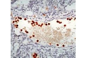 Immunohistochemistry on Frozen and Formalin-Fixed Paraffin Embedded Sections: Use adilution of 1/25-1/100 in an ABC method (30 minutes at room temperature). Requires hightemperature antigen unmasking with 10 mM citrate buffer, pH 6.0 prior to immunostaining. Recommended Positive Control: Tonsil.