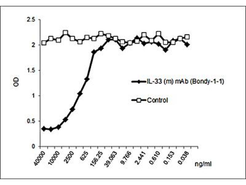 - Interleukin-33 (IL-33, HF-NEV, IL-1F11), a member of the IL-1 family of cytokines, is expressed by many cell types following pro-inflammatory stimulation and is thought to be released upon cell lysis. IL-33 binds to and signals through ST2 (IL-1R1) and its stimulation recruits MYD88, IRAK, IRAK4 and TRAF6, followed by phosphorylation of ERK1 (MAPK3)/ERK2 (MAPK1), p38 (MAPK14) and JNK. The ability of IL-33 to target numerous immune cell types, like Th2-like cells, mast cells and B1 cells, and to induce cytokine and chemokine production underlines its potential in influencing the outcome of a wide range of diseases, such as arthritis, asthma, atopic allergy & anaphylaxis, cardiovascular disease/atherosclerosis, nervous system diseases and sepsis. Anti-IL-33, mAb (recombinant) (blocking) (Bondy-1-1) is an antibody developed by antibody phage display technology using a human naive antibody gene library. These libraries consist of scFv (single chain fragment variable) composed of VH (variable domain of the human immunoglobulin heavy chain) and VL (variable domain of the human immunoglobulin light chain) connected by a polypeptide linker. The antibody fragments are displayed on the surface of filamentous bacteriophage (M13). This scFv was selected by affinity selection on antigen in a process termed panning. Multiple rounds of panning are performed to enrich for antigen-specific scFv-phage. Monoclonal antibodies are subsequently identified by screening after each round of selection. The selected monoclonal scFv is cloned into an appropriate vector containing a Fc portion of interest and then produced in mammalian cells to generate an IgG like scFv-Fc fusion protein.