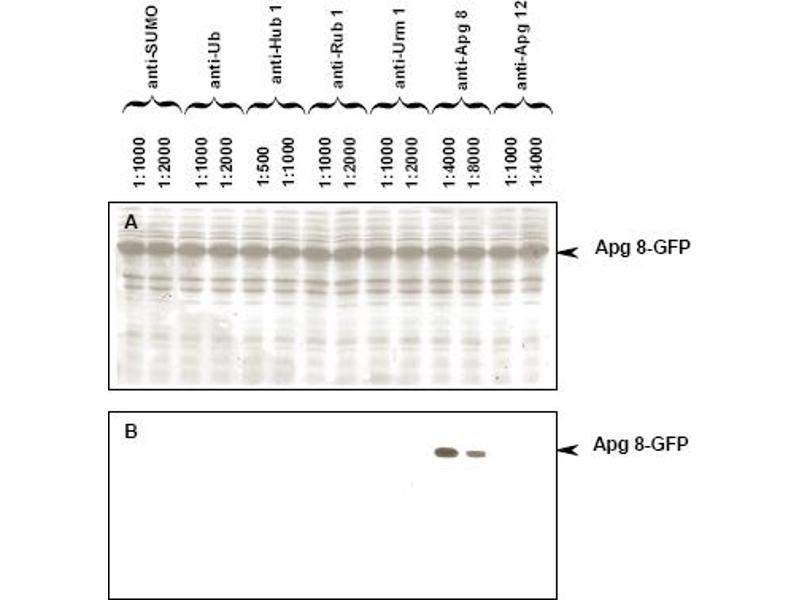 Other intrinsic bands are readilydetectable in yeast lysates at lower antibody dilutions. Recommended Dilutions: For Immunoblotting a 1: 4,000 to 1: 8,000 dilution isrecommended. A 14 kDa band corresponding to yeast APG8 is detected. Most yeast cell lysates can beused as a positive control without induction or stimulation. For ELISA a 1: 20,000 to1: 100,000 dilution is recommended.