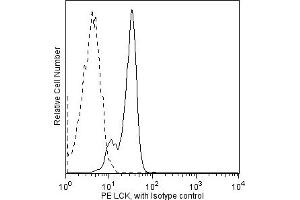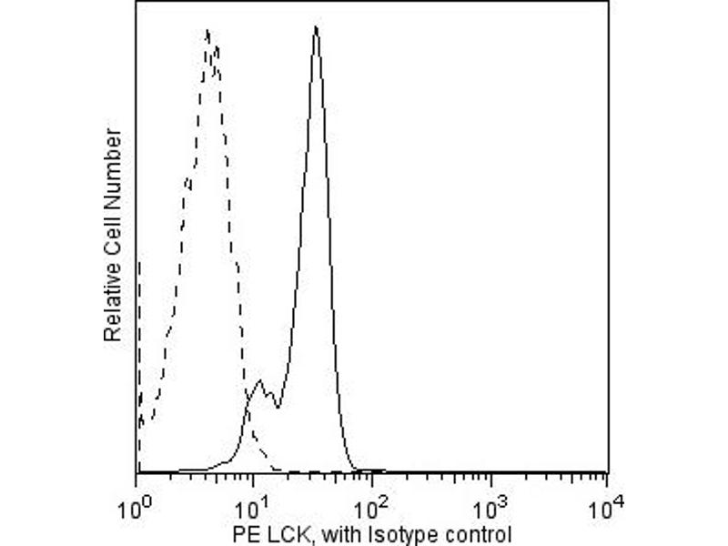 Lck is a member of the Src family of cytoplasmic protein-tyrosine kinases (PTKs) that is normally expressed exclusively in lymphoid cells, primarily T lymphocytes and NK cells. A low level of expression has been detected in B lymphocytes, but its function in B cells is unknown. Its expression in other leukocytes is not well defined. Members of the Src family have several common features: 1) unique N-terminal domains, 2) attachment to cellular membranes through a myristylated N-terminus, and 3) homologous SH2, SH3, and catalytic domains. The unique N-terminal domain of Lck interacts with the cytoplasmic tails of the CD4 and CD8 cell-surface glycoproteins of T lymphocytes, which recognize antigen presenting cells via their surface MHC class II and class I molecules, respectively. The catalytic activity of Lck is regulated by both kinases and phosphatases that control the phosphorylation states of two tyrosine residues that have opposing effects. Repression of Lck's catalytic activity occurs via phosphorylation at tyrosine 505 (Y505), located near the carboxy terminus. Phosphorylation of this tyrosine site is mediated by the Csk family of PTKs, and its dephosphorylation is mediated by the protein tyrosine phosphatase, CD45. When Lck is phosphorylated at this site, it assumes a folded tertiary structure which is enzymatically inactive. When CD45 dephosphorylates it at Y505, Lck is able to autophosphorylate its Y394, which leads to conformational changes in the catalytic domain that induce kinase activity. However, it has been observed that the inhibitory effect of the phosphorylated Y505 can be overcome by direct engagement of Lck's SH3 domain and that both Y394 and Y505 are phosphorylated together in cells activated by hydrogen peroxide. Activated Lck phosphorylates the ITAMs (Immunoreceptor-based Tyrosine Activation Motifs) of the T cell receptor (TCR) and thus is critical for activation and development of T lymphocytes. The interactions of Lck, Csk, CD45, CD4 or CD8, and TCR are only a small part of a complex immunoregulatory cascade that involves additional substrates for Csk and CD45, other enzymes, adhesion molecules, adaptor proteins, and specialized membrane microdomains.
