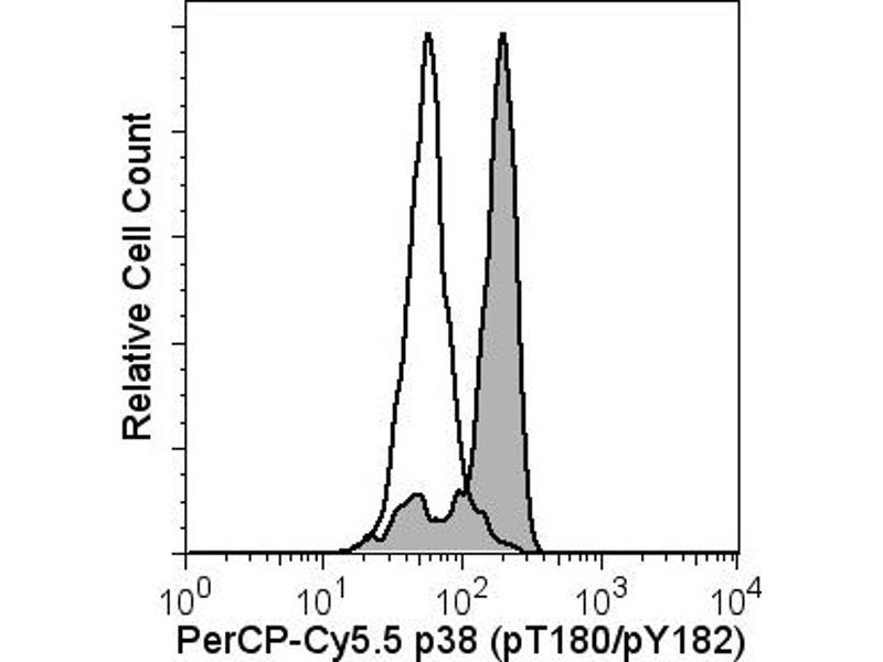 Activation of the immune and inflammatory responses often involves the recognition of bacterial endotoxin (lipopolysaccharide or LPS). Binding of LPS by monocytes results in the production and release of proinflammatory cytokines, such as IL-1 and TNF. LPS-induced signaling cascades involve members of the Ser/Thr protein kinase family known as the Mitogen Activated Protein Kinases (MAPKs). MAPK signal transduction pathways mediate the effects of various extracellular stimuli on biological processes such as proliferation, differentiation, and death. The p38 MAPKs include p38alpha (MAPK14), beta (MAPK11), gamma (MAPK12), and delta (MAPK13). These Ser/Thr kinases are activated by dual phosphorylation on threonine (T) and tyrosine (Y) within the motif Thr-Gly-Tyr located in kinase subdomain VIII. Activation of p38 MAPK is mediated specifically by the MAP Kinase Kinases, MKK3, MKK4, and MKK6. This leads to the activation of multiple transcription factors (NF-kappaB, ATF-2, Elk-1, and CHOP) that induce expression of many different genes, including proinflammatory cytokine genes. Thus, p38 MAPKs are central kinases in multiple signal transduction pathways. The 36/p38 (pT180/pY182) monoclonal antibody recognizes the conserved dual phosphorylated site pT180/pY182 of p38alpha, beta, gamma, and delta.