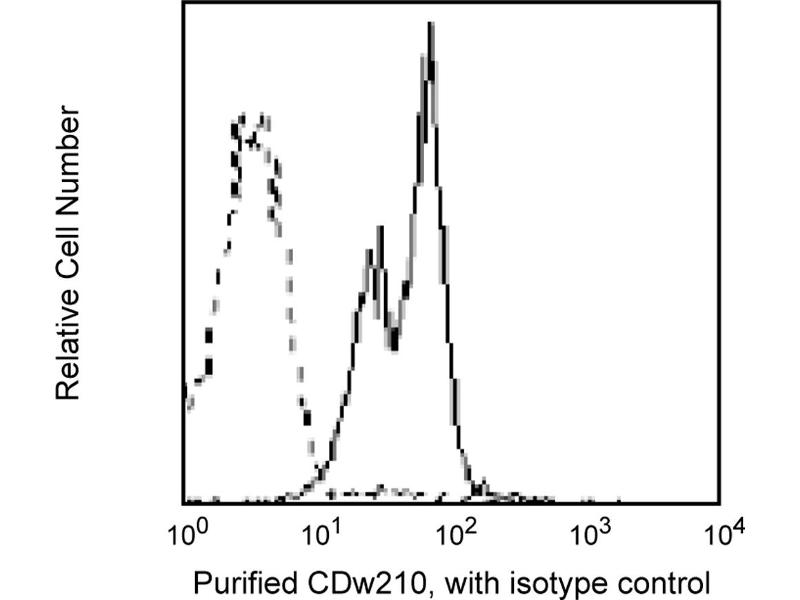 Reacts with 90-110 kDa protein expressed on T cells, B cells, NK cells, and monocyte/macrophages. It belongs to the class II cytokine receptor family which includes IFNgammaR (CDw119), IFNalpha/betaR (CD118) and tissue factor (CD142). IL-10R has been found to play a role in signal transduction by activating specific STAT proteins (STAT3 and STAT1) and inducing gene transcription. Other reports indicate that IL-10 protein binding to NK cells appears to be stimulatory, in contrast to its binding to T cells and monocytes/macrophages. Clone 3F9 is specific for human IL-10R and its binding to the receptor can be blocked by recombinant human IL-10 (rhIL-10).
