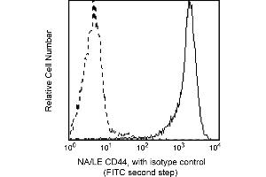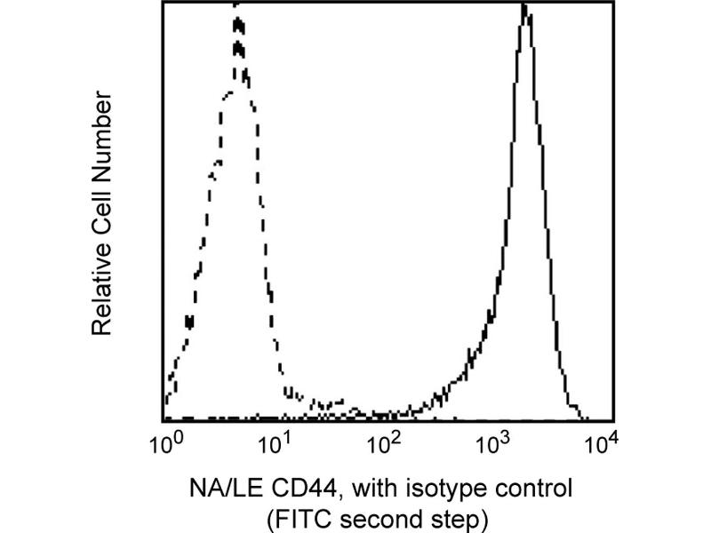 Reacts with CD44, and 85 kDa glycoprotein that is expressed on leukocytes, erythrocytes, epithelial cells and weakly on platelets. CD44 is a member of the hyaladherin family of hyaluronan-binding proteins, with structural similarities to selectins. It has a functional role in cell migration, lymphocyte homing and adhesion during hematopoiesis and lymphocyte activation. 515 monoclonal antibody has been reported to be able to block cell adhesion to the hyaluronic acid. Flow cytometric analysis for CD44. Human peripheral blood lymphocytes were stained either with the Purified NA/LE Mouse Anti-Human CD44 antibody (solid line) or a Mouse IgG1 isotype control (dashed line) followed by a FITC Goat Anti-Mouse IgG/IgM polyclonal secondary antibody and analyzed on a BD FACScan™ instrument.