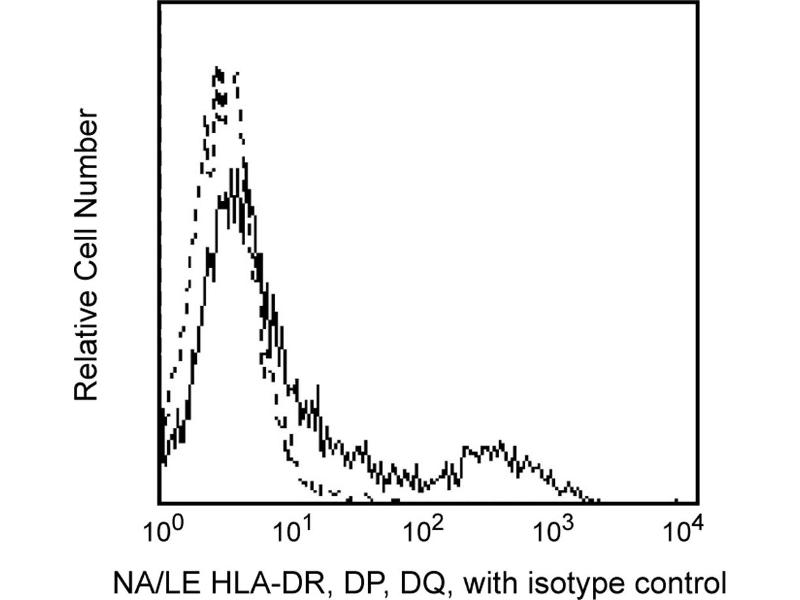 Reacts with all major histocompatibility Class II HLA-DR, DP and most DQ antigens expressed on B cells, antigen presenting cells and activated T cells. This antibody has been reported to be useful for mixed lymphocyte reactions (MLR) in addition to being able to fix complement.