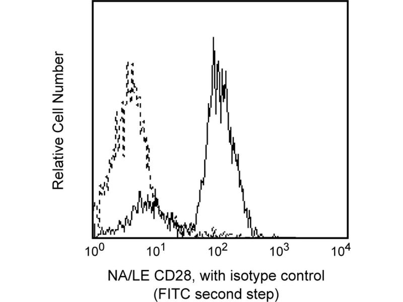 The CD28.2 monoclonal antibody specifically binds to CD28, a 44 kDa homodimeric transmembrane glycoprotein present on most mature T cells, thymocytes and plasma cells. CD28 is a costimulatory receptor that binds CD80 and CD86 as ligands and plays a very important role in T cell-B cell interactions. It has been suggested that CD28 initiates and regulates a separate and distinct signal transduction pathway from those stimulated by the TCR complex. Additionally, it has been reported that CD28 antibody clones vary in their ability to stimulate T cells to produce IL-2 and increase intracellular Ca2+ concentration. This finding suggests the existence of functionally distinct subregions on the CD28 molecule. CD28.2 has been demonstrated to bind to the same molecule as clone L293, another CD28 mAb, and has been reported to induce Ca2+ influx in Jurkat T cells.