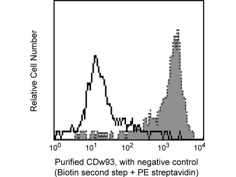 The immunogen used to raise R139 antibody was C1q-binding protein preparation derived from U937 cell lysates, as described. Human CDw93 (C1qRp) is a 631 AA, single chain type I membrane glycoprotein expressed on cells of myeloid origin, endothelial cells, and hematopoietic progenitor cells. Human, murine and rat protein sequences have been deduced from cDNA clones and are known to be similar in sequence and organization. CDw93 (C1qRp) binds C1q, the recognition subunit of the first component (C1) of the complement pathway, as well as MBL (Mannose-binding-lectin) and SPA (Pulmonary Surfactant Protein A). Multivalent interaction of CDw93 (C1qRp) expressing cells with C1q, MBL, and SPA, induces enhancement of phagocytosis of suboptimally opsonized particles and/or cellular debris. Antibody R139 neutralizes/blocks C1q-mediated enhancement of phagocytosis, as reported. In addition clone R139 is suitable to detect CDw93 (C1qRp) expression on cells by flow cytometry, CDw93 (C1qRp) in cellular lysates by Western blotting or immunoprecipitation. CDw93 (C1qRp) has been reported to define a human stem cell population with hematopoietic and hepatic potential.