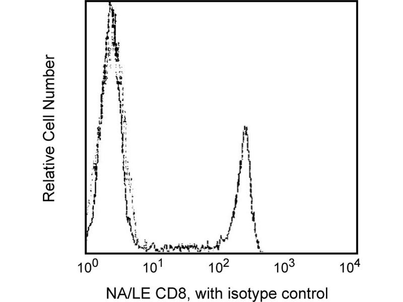 Reacts with the alpha subunit (32 kDa) of the two-chain complex. CD8 molecule binds to HLA class I molecules during interaction of CD8+ T cells with antigen-presenting cells or with target cells. CD8 is expressed on T cytotoxic/suppressor cell populations. HIT8a stains approximately 13 - 48% of peripheral blood lymphocytes and 80% of thymocytes, as well as a subset of NK cells. Clones HIT8a and RPA-T8 (Cat. No. 555364) are not cross-blocking.