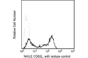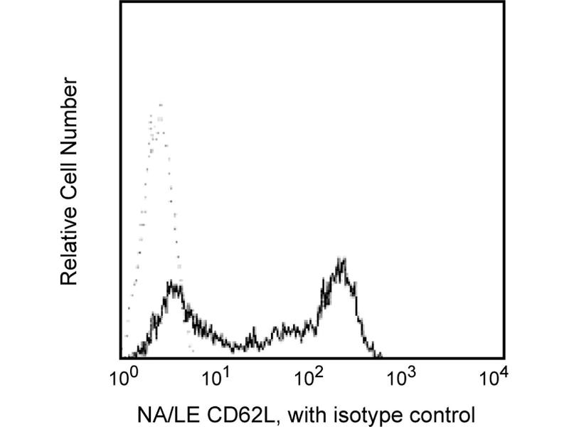 Reacts with a 76-95 kDa glycoprotein referred to as L-selectin or LECAM-1. CD62L is expressed on neutrophils, monocytes, T- and B-lymphocyte subsets and NK cells. Dreg-56 antibody recognizes the same antigen as LAM-1, and specifically inhibits >90% of binding of human lymphocytes to high endothelial venules (HEV) in frozen sections of peripheral, but not mucosal lymphoid tissue. It thus defines L-selectin as a human lymphocyte homing receptor for peripheral lymph node HEV. This antibody is routinely tested by flow cytometric analysis.