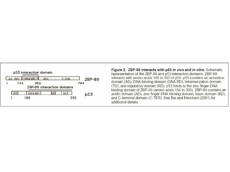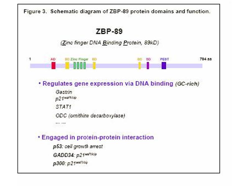 - The GI tract abundantly expresses growth factors many of which bind and activate the EGF receptor present on mucosal cells. One such factor is the zinc finger protein (ZBP-89) that binds to a GC-rich DNA element in the gastrin promoter and confers EGF responsiveness. The fulllength protein functions as a repressor of growth factor signals regulating the gastrin promoter. Several other growth related promoters are also regulated by ZBP-89. ZBP-89 is one of a family of related transcriptional regulators. It has been reported in recent studies that ZBP-89 regulates growth in part by stimulating the cyclin-dependent kinase inhibitor, p21waf1, in a butyrate-dependent manner through recruitment of the histone acetyl transferase p300. Moreover, ZBP-89 triggers growth arrest in a p53-dependent manner by preventing nuclear export of p53. ZBP-89 also induces apoptosis, but this process occurs independent of p53.Synonyms: Transcription factor ZBP-89, ZBP89, Zinc finger DNA-binding protein 89, Zinc finger protein 148