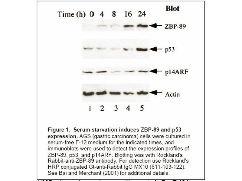 This polyclonal antibody reacts human ZBP-89 in a variety of immunological assaysincluding western blot and ELISA. This antibody is likely functional inimmunohistochemistry and immunoprecipitation. Recommended dilutionsImmunoblotting: 1: 5,000. A band at approximately 89 kDa corresponding to human ZBP-89is detected. Human monocytes or macrophages or nuclear extracts from PMA treated U937cells can be used as a positive control. ELISA: 1: 10,000 - 1: 30,000.