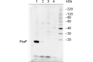 - KLH-conjugated synthetic peptide derived from the PsaF protein sequence of Arabidopsis thaliana (At1g31330). This peptide sequence is not completely conserved in mono- and dicots.