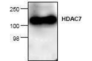 Human HDAC7 is composed of 912 amino acid residues. Although HDAC7 is localized mostly to the cell nucleus, it is also found in the cytoplasm, suggesting nucleo-cytoplasmic shuttling. The histone deacetylase activity of HDAC7 maps to a carboxy-terminal domain and is dependent on interaction with class I HDACs in the nucleus. HDAC7 catalyzes removal of acetyl-groups from acetyl-lysines of histones and promotes compaction of chromatin in these regions, leading to the inhibition of gene transcription.Synonyms: HD7, HD7a, HDAC7A, Histone deacetylase 7