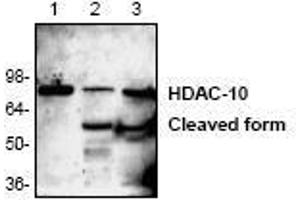 - The antibody recognizes 74 kDa HDAC-10. A 55 kDa cleavage fragment can also be detected in mouse and rat tissue lysates.