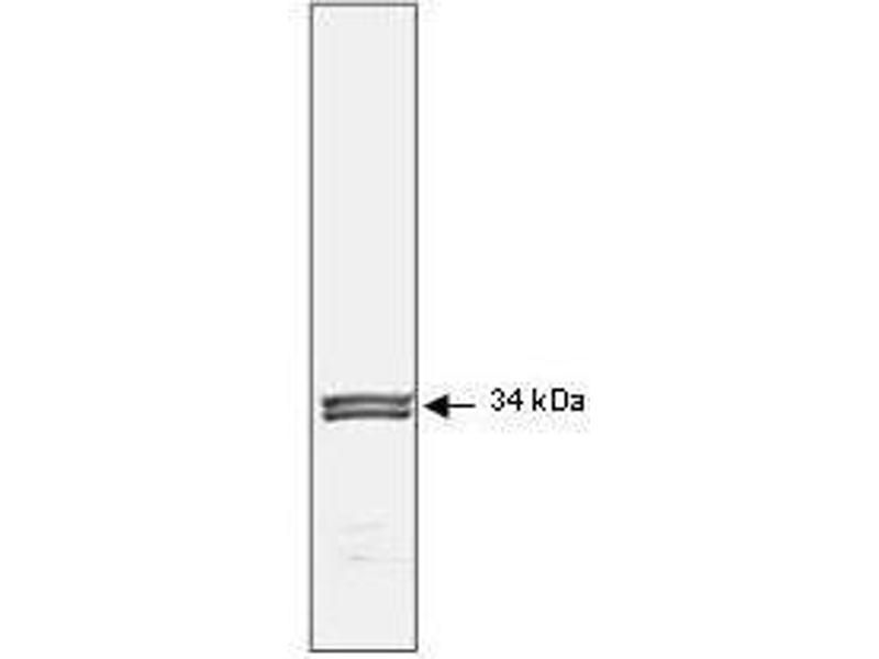 Application Note: Anti-p34 cdc2 has been tested by western blot and is suitable for immunohistochemistry, immunoprecipitation (as active kinase), and immunoblotting. The antibody detects the three bands within the 34kD region corresponding to the p34 protein and its cleavage products.  HeLa cell lysate or human colon carcinoma is suggested as a positive control for immunoblotting.  LEP fibroblast cell lysate is suggested as a negative control.   Paraffin embedded tissue is reactive for immunohistochemistry using high temperature release and 0.1 % saponin treatment or other permeabilization method.