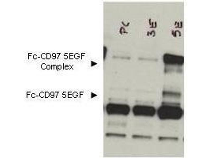 Immunogen: This affinity purified antibody was prepared from whole rabbit serum produced by repeated immunizations with a recombinant protein corresponding to amino acids 1-512 (extracellular domain) of mouse CD97 protein.
