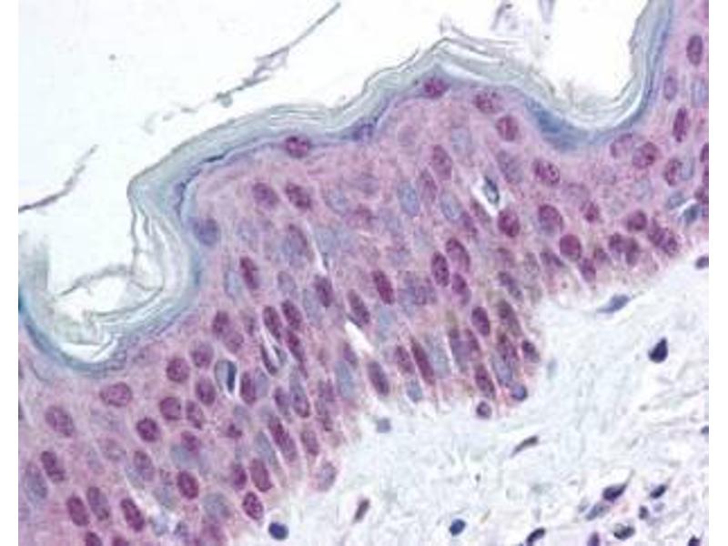 Immunogen: This affinity purified antibody was prepared from whole rabbit serum produced by repeated immunizations with a synthetic peptide corresponding to amino acids 19-28 of human HMGN protein (see below).