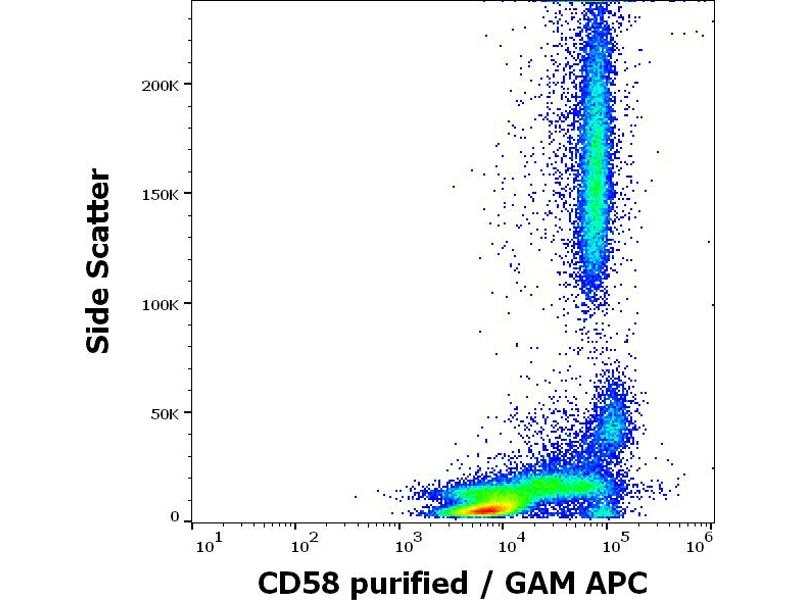 CD58 Molecule,CD58 (LFA-3) is an immunoglobulin family adhession molecule expressed by both hematopoietic and non-hematopoietic cells (often on antigen presenting cells) and serving as ligand of CD2. This interaction is important for T cell-mediated immunity. CD58 is expressed in transmembrane form and in GPI-anchored form, the later is constitutively associated with protein kinases whereas the transmembrane form activates kinase activity upon triggering. CD58 is a powerful tool for detection of minimal residual disease in acute lymphocytic leukemia, and for evaluation of liver damage related with hepatitis B.,LFA3, AG3