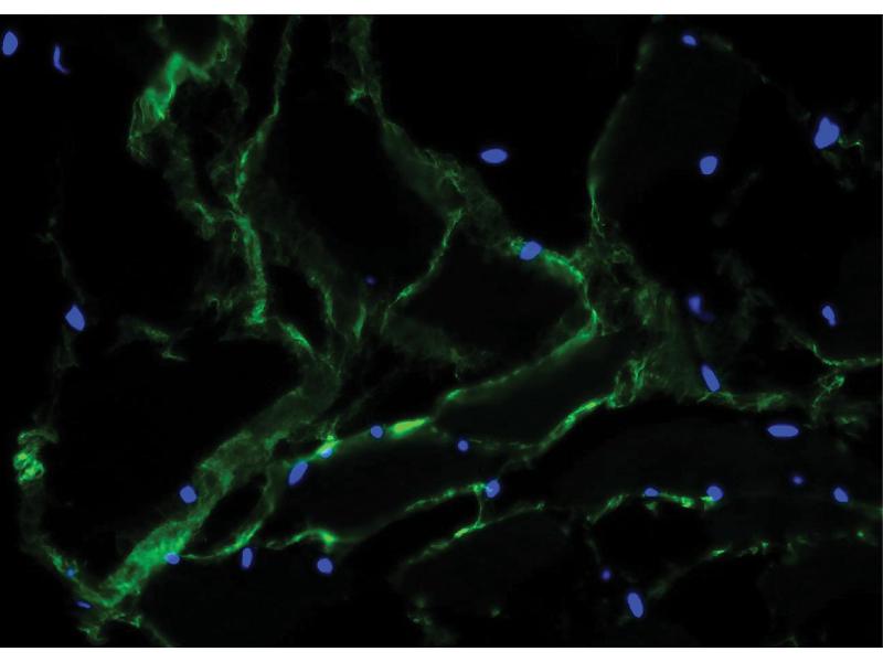 In immunohistochemical staining of paraformaldehyde-fixed human skin, mAb 11C1.3 labels the elastic framework and more specifically the oxytalantic network close to the epidermis. The antibody also exhibits discrete staining of normal fibroblasts in culture and of extracellular (elastin) fibrils in a variety of tissues. There is an aberrant expression of fibrillin in Marfan syndrome. -