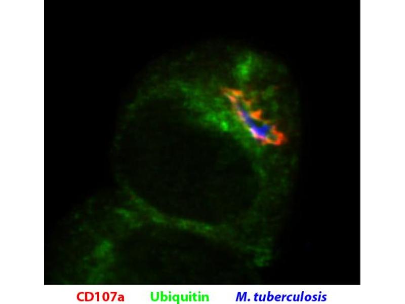 - CD107a, also known as lysosomal-associated membrane protein 1 (LAMP-1), is a heavily glycosylated, type I transmembrane protein that constitutes one of the two major sialoglycoproteins on lysosomal membranes that can be used to distinguish lysosomes from other organelles. It is a ligand for galaptin, an S-type lectin present in extracellular matrix, through its recognition of acetyllactosamine oligosaccharide chains, and is a ligand for E-selectin-mediated cell adhesion. CD107a is principally expressed in epithelial cells and macrophages in a variety of organs in normal and Beige mutant mice. LAMP-1 may function in protecting the inner surface of the lysosomal membrane by forming a barrier to lysosomal hydrolases.