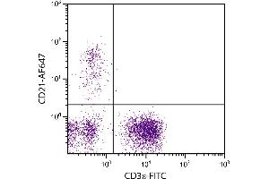 CD21, also known as complement receptor 2, is expressed on all mature circulating B lymphocytes but not on T lymphocytes or natural killer cells. Low density CD21 has also been reported on granulocytes and monocytes.