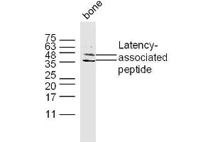 Background: Latency-associated peptide: Required to maintain the Transforming growth factor beta-1 (TGF-beta-1) chain in a latent state during storage in extracellular matrix. Associates non-covalently with TGF-beta-1 and regulates its activation via interaction with 'milieu molecules', such as LTBP1, LRRC32/GARP and LRRC33/NRROS, that control activation of TGF-beta-1. Interaction with LRRC33/NRROS regulates activation of TGF-beta-1 in macrophages and microglia (Probable). Interaction with LRRC32/GARP controls activation of TGF-beta-1 on the surface of activated regulatory T-cells (Tregs). Interaction with integrins (ITGAV:ITGB6 or ITGAV:ITGB8) results in distortion of the Latency-associated peptide chain and subsequent release of the active TGF-beta-1.