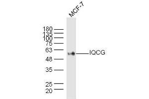 Background: IQCG is a 443 amino acid protein containing one IQ domain. Widely distributed in nature, the IQ domain forms an amphiphilic seven-turn -helix capable of binding calmodulin in a Ca2+-independent manner. The level of intracellular calcium is tightly regulated in all eukaryotic cells. A modest increase in this level can result in a myriad of physiological responses, most of which are mediated by calmodulin (CaM), the universal calcium sensor. In acute T-lymphoid/myeloid leukemia, IQCG forms a complex with Nup98, an O-linked glycoprotein and a component of the nuclear pore complex. NUP98-IQCG complex bind co-activators and/or co-repressors, which suggest a role in transcriptional regulation.Nup98-IQCG complex inhibits 32Dcl3 cell apoptosis induced by Arabinofuranosylcytosine (Ara-C) and partially blocks granulocyte differentiation induced by G-CSF. IQCG exists as two isoforms due to alternatively splicing events.